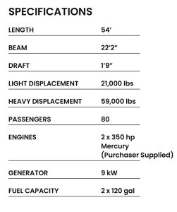 Custom designed and equipped for Sunset Watersports – Key West. The design features an upper deck with seats and steering station, a solid foredeck with two kayak storage areas and “stairway to the sea’, multiple seating areas, an expanded bar and food service area and a swim ladder and paddle board launch, retrieve and storage area on the aft deck.