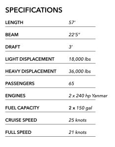 A GC57 power cat developed to carry workers and cargo to an island development project in the Gulf of Panama. The focus is on full load 21 cruise speed and fuel efficiency.