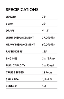 Caribbean Spirit, 78′ Day Charter is the largest sailing craft that we have built, sat at the cusp of our transition from wood to foam. This was in the spring of 2001. All of her large panels were foam/glass vacuum bagged including her hulls which were built in a female mold. In contrast, all of her primary structural members were still engineered from Douglass Fir; main cross beams, bridge-deck floor beams, head-stay beam and wing-spar. In order to keep the sail handling controllable she sports a schooner rig with masts of equal height. She still sails like a banshee! Capable of high performance sailing and USCG certified for 100 passengers.