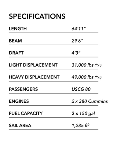Custom designed and equipped for East Island Excursions in Puerto Rico. The design features multiple seating areas and capabilities for day sailing locally (including Culebra and Vieques) as well as dinner excursions. Operational enhancements include an expanded bar layout with provisions for drink service, a drop down food counter, storage for Cambro food handlers, custom salon cushions and a teak buffet table centerpiece. Guest amenities include a stairway to the sea forward, bow deck seating and a swim platform and a waterslide aft. Additionally an extra wide aft beam with stairs and safety rails allows guests to more closely experience catamaran sailing.