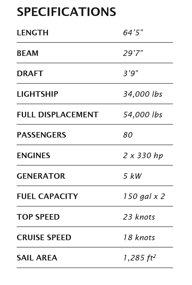 Honu Lani is custom designed and equipped for Hawaii Nautical Inc. for tours in Oahu. The layout features multiple seating areas with tables to accommodate up to 80 passengers. Our engineers designed the seating arrangement to also allow for high-end dinner charters that give the operator additional channels of revenue generation. The dinner layout configuration allows for up to 40 guests. The large bar and teak food service table is accompanied by a storage room and food-prep area with refrigerators. Guests can enjoy the water with two stern swim platforms and a stairway to the sea forward, which also allows for beach loading.