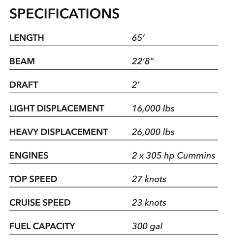 The GC65P ferry is based on the earlier successful Suncat models. This vessel will be more efficient than any vessel you can find. Test it. 305 horse power per side allows a cruise speed of 24 knots while burning only 18 gallons and hour. Top speed is 27 knots. The secret? Long fine displacement hulls with ‘canoe’ sterns (therefore, double ended) which run pretty much dead level with no lift at all. Weight has been minimized and yes, there is some carbon fiber in the floor and other parts of the structure. The hulls and other components are e-glass/corecell foam and epoxy.
