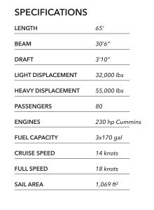 A custom designed and built resort passenger vessel for BEACHES and SANDALS Resorts combining the successful Gold Coast Yachts sailing hull form and structure with a SANDLES’ accommodation plan to create a unique resort vessel.Underwing clearance will be at least 40″ forward. Large rounded sheers. Hulls approx 6’9″ wide at OWL 3.5. 6’4″ interior hull headroom. Fixed fiberglass keels.Kevlar beaching shoes. Single level bridgedeck with curved beam steps. Custom made aft deck tube water slide with access platform.Enlarged roof. Cabin sides pushed out to sheer with midsection inset for opening windows. Closed seats with large radius and curved edges pushed out to hull centerline. Interior walls, bar walls, helm station walls and retail counter have rounded corners.46″ wide stairs into hulls.Overhanging salon roof with curved edge. Glass face retail display and sales counter.