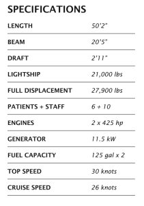 The Liston ‘Huntie’ Sprauve ambulance boat is a purpose built response vessels for the U.S. Virgin Islands Department of Health, serving as the water ambulance for the island of St. John. With a top speed of 30 knots, a 10ft tender, scene lights, PA system, and ample working deck space, this vessel also served as an emergency response vehicle for the entire St. Thomas – St. John district. The catamaran design is an ideal platform, allowing for a large 300 ft2 air conditioned patient compartment which is capable of handling the rough local waters. The patient compartment has a complete medical fit-out and can accomodate 6 patients and 8 medical staff. The raised pilothouse, separate from the patient area, provides the captain and crew excellent visibility and command of the ship.