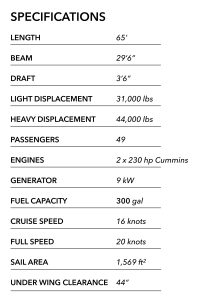Custom designed and equipted for Kaanapali Tours off the beach whale watching and snorkeling operations in Maui. The design features multiple seating and whale watching areas plus an enlarged salon roof. The cabin is open and spacious. The aft beam has been widened with stairs and safety rails to allow guests to more closely experience the