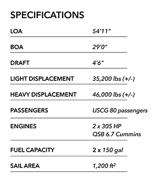 Custom designed and equipped for Trilogy Excursions on Maui. The GC54MS was designed to carry 80 passengers and specified Trilogy guest amenities with 40″ underwing clearance forward. The design features an expansive deck with multiple seating, dining and whale watching areas. There are three water access points and extensive food and beverage service capabilities. Trilogy VI is a sistership to Trilogy I.
